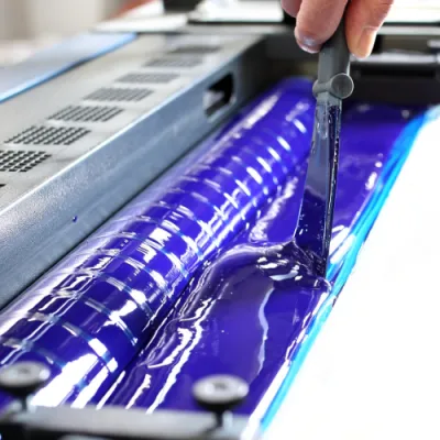 Método de impresión de alta calidad que utiliza planchas y mantilla de caucho para transferir el diseño al papel. Ideal para grandes tiradas.
